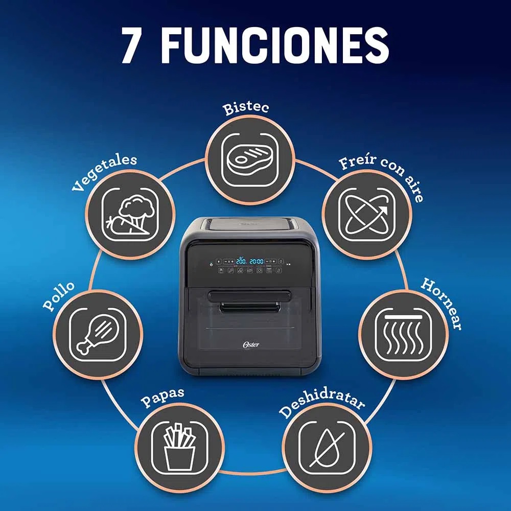 Con esta súper freidora de aire de 10 litros puedes freír tus alimentos utilizando 99.5% menos aceite comparado con otras freidoras de 4L. Su panel digital, la hace fácil de utilizar porque es automática y programable, para controlar tiempos y temperaturas. La súper freidora de aire es tu aliada perfecta para la cocina, ya que también hornea, rostiza y deshidrata. En el mundo agitado de hoy día, Oster® te ofrece la solución para preparar comidas más sanas y deliciosas con la súper freidora de aire. Este modelo te brinda la versatilidad de poder cocinar alimentos fritos con menos aceite y una variedad de comidas adicionales como pollo, carne, vegetales y mucho más. La manera que funciona la súper freidora de aire es que el aire caliente circula a una velocidad rápida, repartiendo el calor en forma homogénea en el interior, sin tener que usar más que un poquito de aceite para que la comida no se pegue, y quede deliciosa y crujiente.