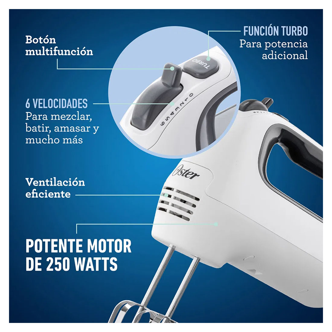 Esta práctica batidora de mano Oster® te permite preparar desde gruesas masas de galletas hasta delicados merengues. El diseño ergonómico de su mango te brinda máxima comodidad para que prepares deliciosas comidas y postres con mayor facilidad. Además, cuenta con 6 velocidades y una función de Turbo que provee potencia adicional al toque de un botón. Ya sea para batir o amasar, esta batidora de mano Oster ® te hará la tarea mucho más fácil.