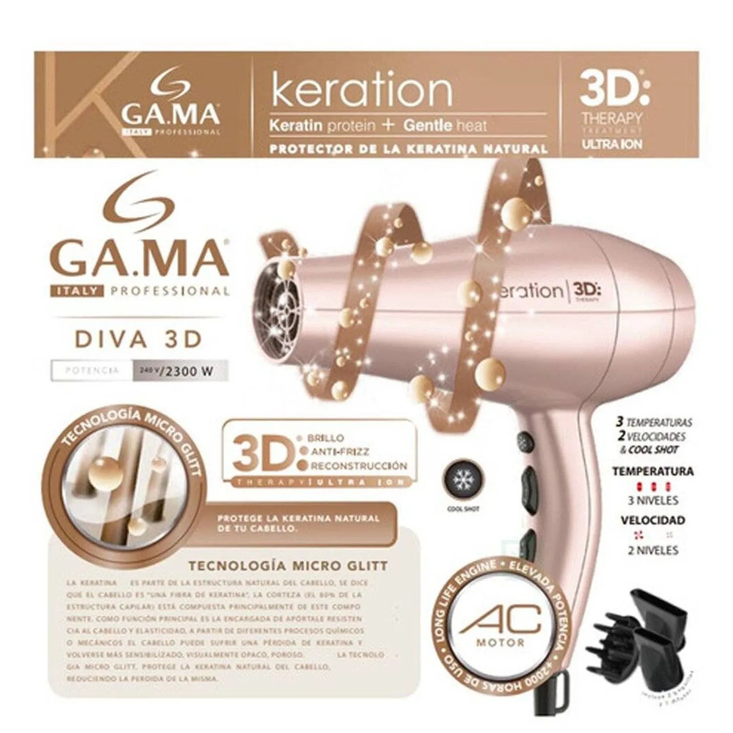 El secador Diva 3D Keration combina la innovadora tecnología Micro Glitt y la tecnología 3D Therapy que brinda brillo, anti frizz y reconstrucción al cabello.