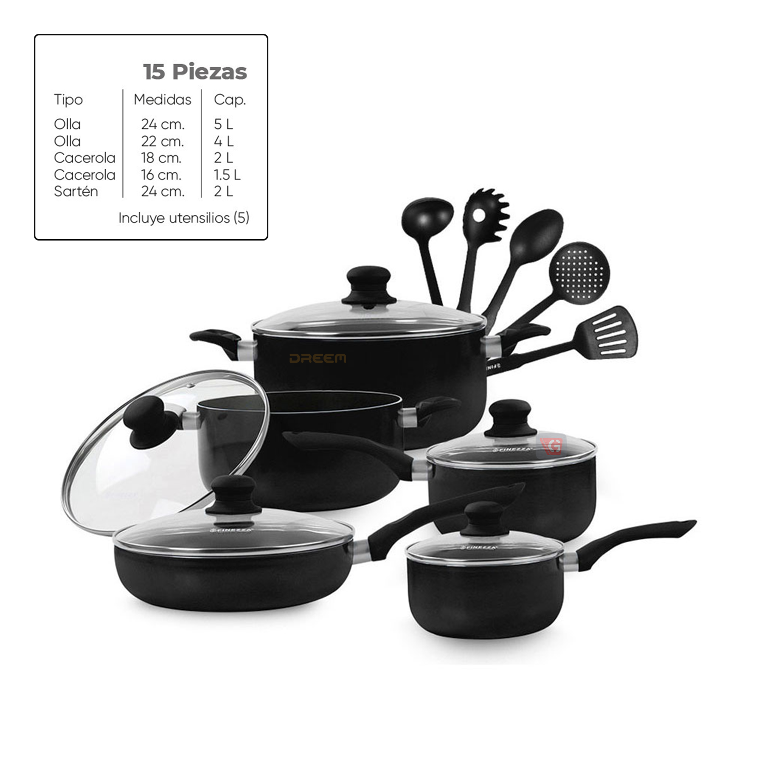 • Capacidad en litros: Olla 1: 5 lts / Olla 2: 4 lts / Cacerola 1: 2 lts / Cacerola 2: 1.5 lts / Sartén: 2 lts