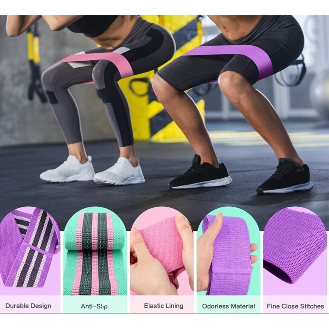 Las bandas de resistencia para mujeres se pueden utilizar para una amplia variedad de ejercicios, tales como: abducción de piernas, puentes de glúteos, sentadillas, prensa de piernas, empujes de cadera, levantamiento de pesas, levantamiento de pesas, cuclillas de aire, sentadillas laterales, secuestro y abducción de cadera, contracciones internas y externas del muslo, retrocesos, etc. Excelente para todos los niveles, desde principiantes hasta atletas.