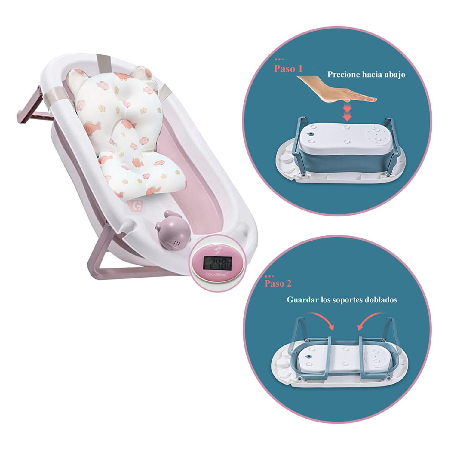 Compartimos contigo la grandiosa experiencia de ser padres, es por esta razón nosvpreocupamos por el confort y la seguridad de tu bebé, así como también de tu tranquilidad, por ello, te traemos la nueva tina de baño completamnete plegable con un diseño divertido, que al más pequeño de la casa le fascinará. Esta tina de baño plegable está elaborada especialmente para el momento del baño del engreído de la casa, que soportará sin problemas el peso de tu bebé y es súper confortable, también cuenta con un cómoda almohadilla con relleno de unicel es ideal para la comodidad de tu bebé.