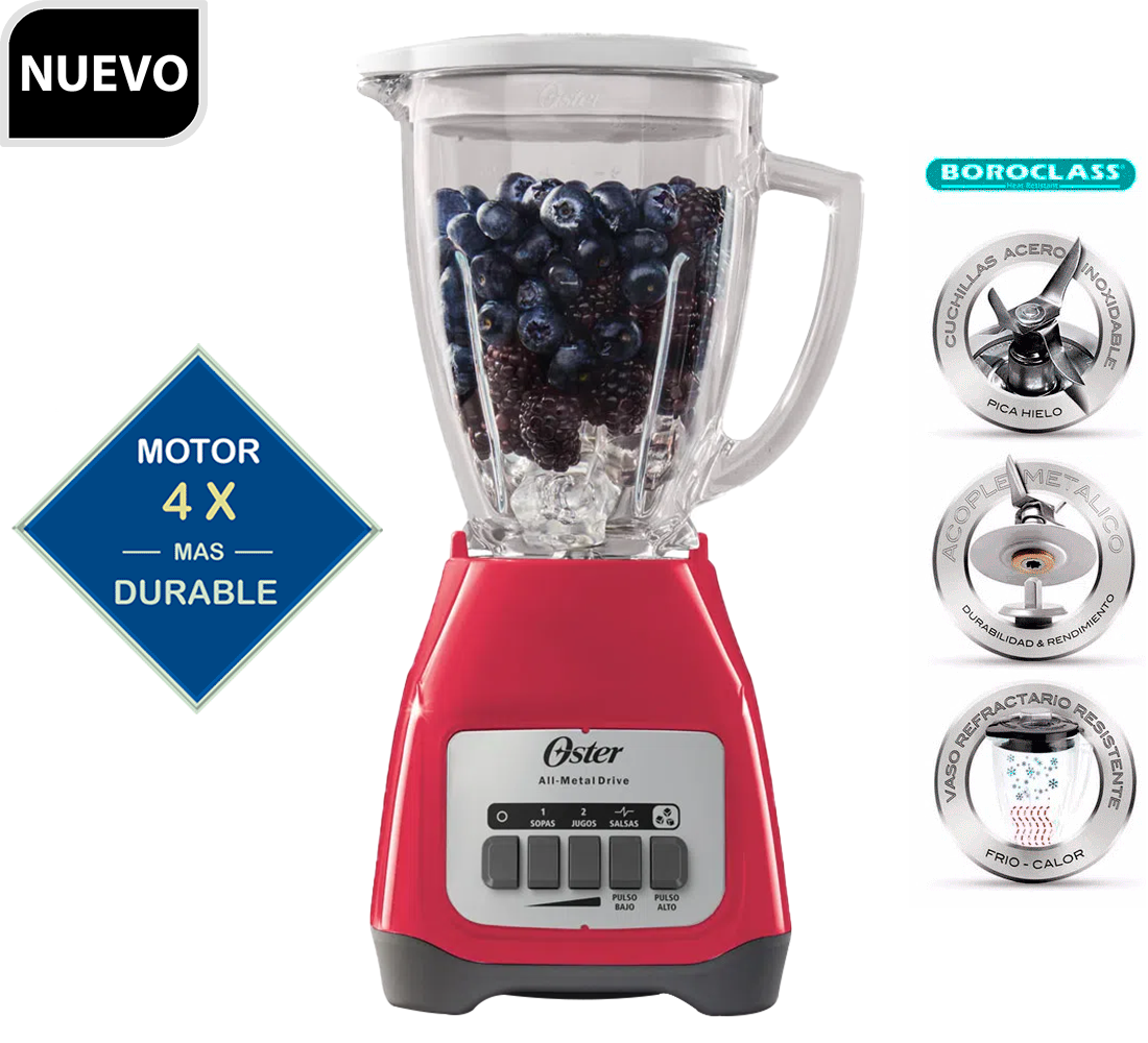 El poderoso motor con alta fuerza de torsión y vaso de vidrio refractario Boroclass® de la licuadora Oster® son ideales para preparar una amplia variedad de recetas frías y calientes, jugos, batidos y mucho más.