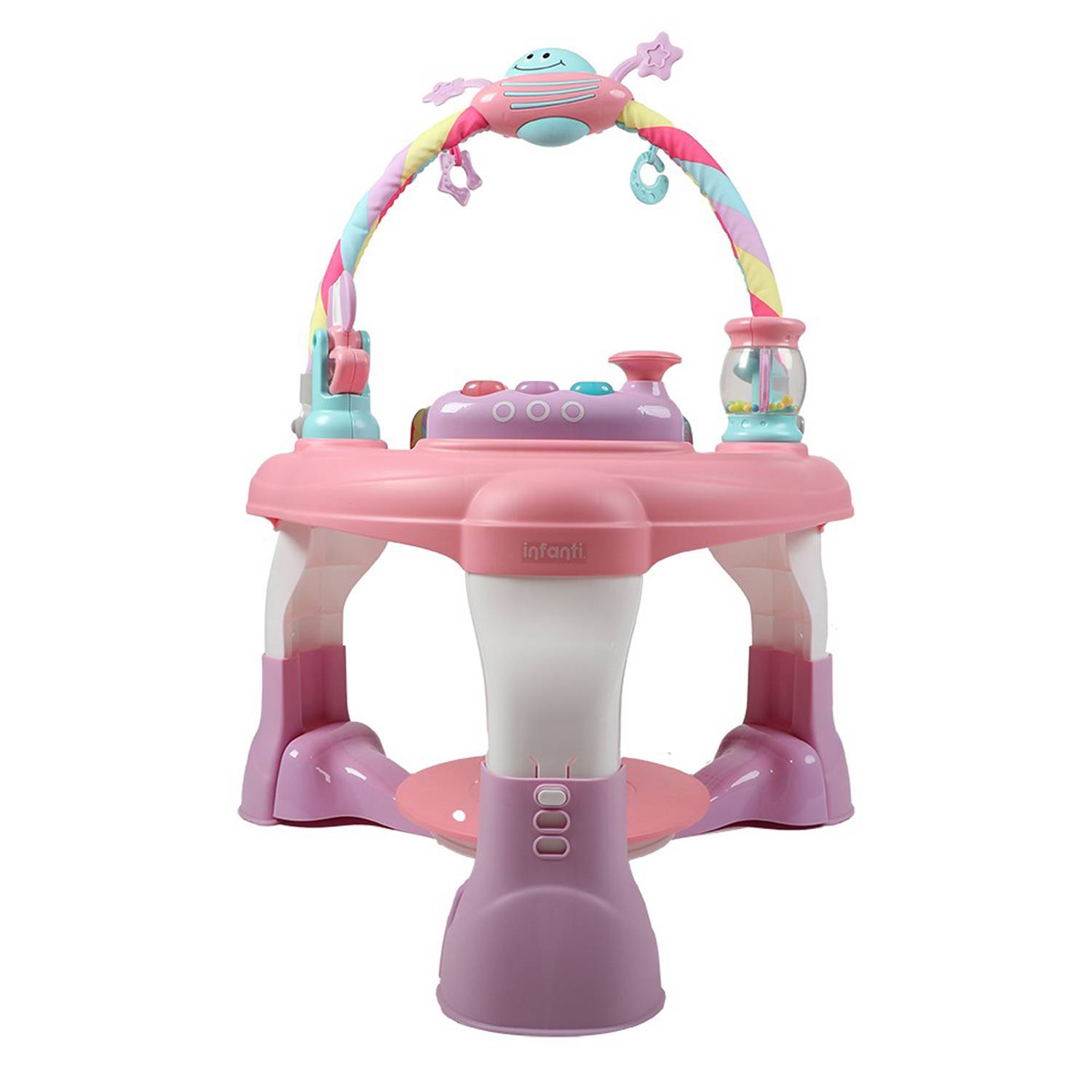 El increíble Centro de actividades 2 en 1 de Infanti, ¡crece según el desarrollo y necesidades de tu pequeño! Úsalo en cualquiera de sus modos: Para jugar sentado; jugar parado interactuando con los entretenidos juguetes que lo rodean; o convirtiendo el centro en una práctica silla y mesa para diferentes actividades. ¡Tú eliges! El cómodo asiento gira en 360°, por lo que tu pequeño tendrá acceso fácil a todos los juguetes y mordedores, ¡que también podrás extraer para jugar de forma independiente! Además, ¡la bandeja de juguetes cuenta con LED y música! También cuenta con una cesta para almacenar artículos y puedes ajustarlo en sus 3 posiciones de altura regulables, las que permiten que este centro de actividades crezca con tu hijo. Y cuando tu pequeño ya se para solo, ¡la tapa central funciona como rebote para que tu hijo pueda saltar! Su diseño es entretenido, novedoso y muy llamativo para los más pequeños, quienes querrán disfrutar cada momento en él. ¡Perfecto para utilizar desde los 4 meses+! ¡Cuidamos lo que más amas!Características: Centro de actividades con 3 modos de uso: o Jugar sentadito o El niño puede estar de pie, jugando e interactuando o Mesa de juguete con silla Se convierte en una mesa con silla Posee una cesta para el almacenamiento de pequeños juguetes El Asiento gira en 360° para que su hijo tenga acceso a todos los juguetes. Posee 3 posiciones de altura regulables, que permite que el centro de actividades crezca con su hijo La tapa central funciona como rebote para que los niños salten cuando se utiliza como centro de actividades. Bandeja de juguetes independiente con LED y música Los juguetes móviles incluyen un bote oscilante con mordedor y un frasco giratorio con cuentas de plástico de colores en el interior Barra de juguetes con un juguete de modelado de nave espacial para atraer la atención de los niños y mordedores extraíbles para que los niños muerdan y jueguen Requiere dos pilas AA de 1,5 V (no incluidas) La barra de juguetes se puede dejar cuando se usa una mesa de juego Edad recomendada: 4 meses + Medidas: 74x78x88 cm Peso máximo recomendado en el centro de actividades: 11 kilos Peso máximo recomendado en la estación de juegos: 25 kilos