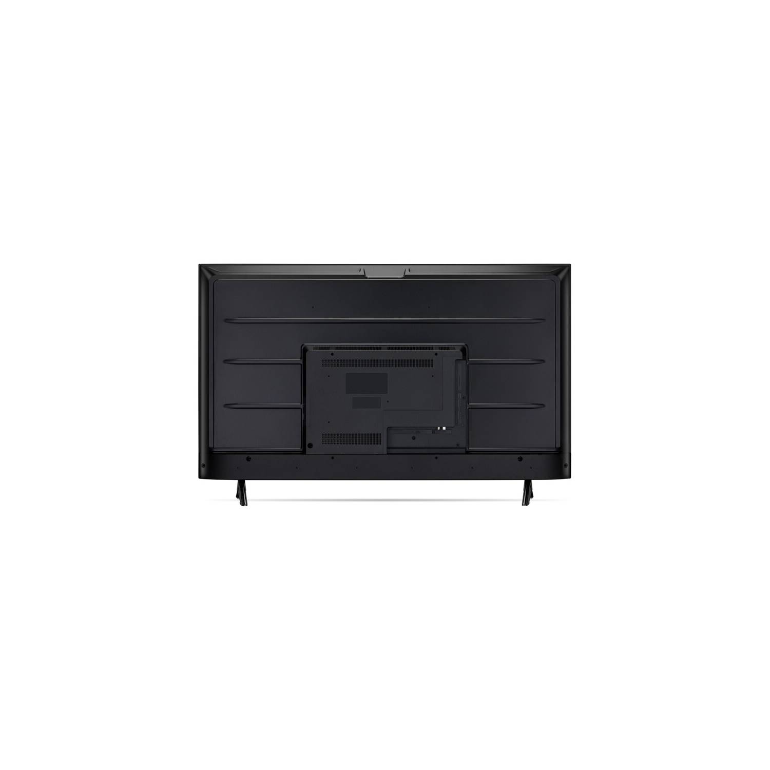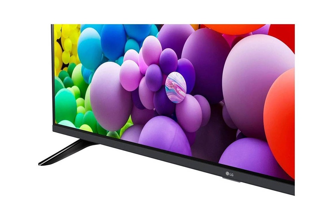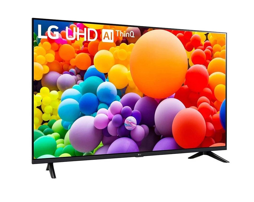 Embalaje de LG UHD sobre un fondo beige con árboles ilustrados.