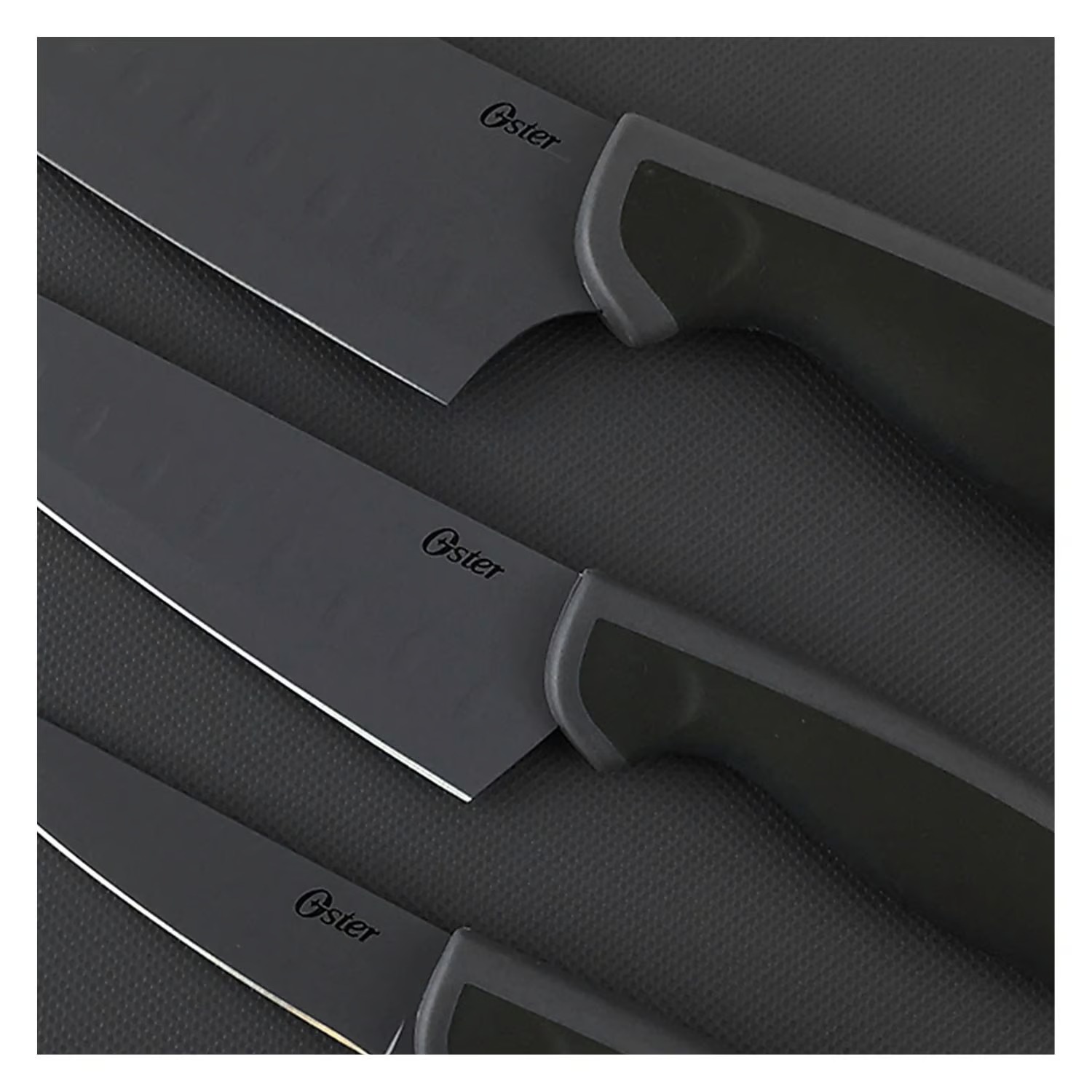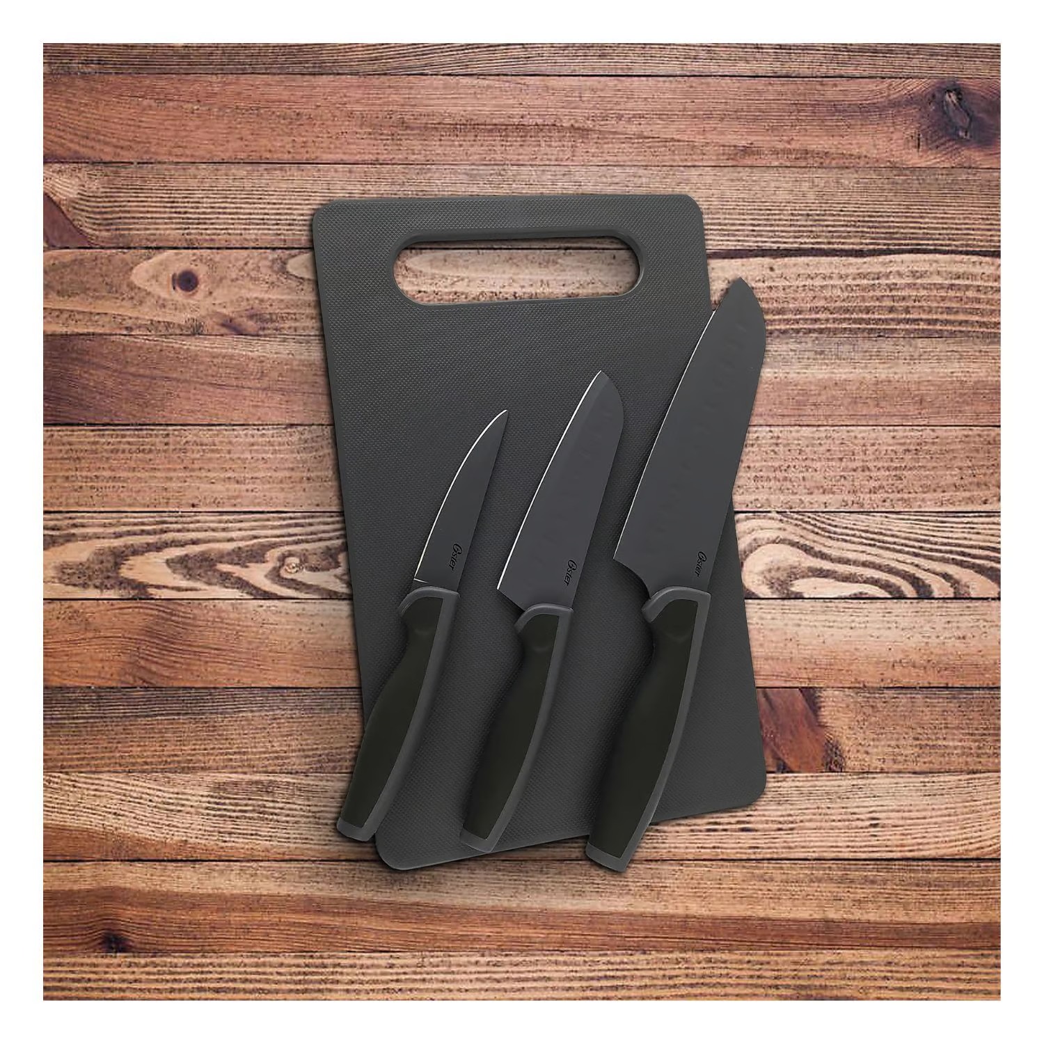 Mejora tu juego de cocina con el juego de cuchillos Oster que incluye una tabla de cortar versátil y tres elegantes cuchillos de acero inoxidable. La tabla de cortar antiadherente garantiza un corte suave, lo que facilita la preparación de la comida.”