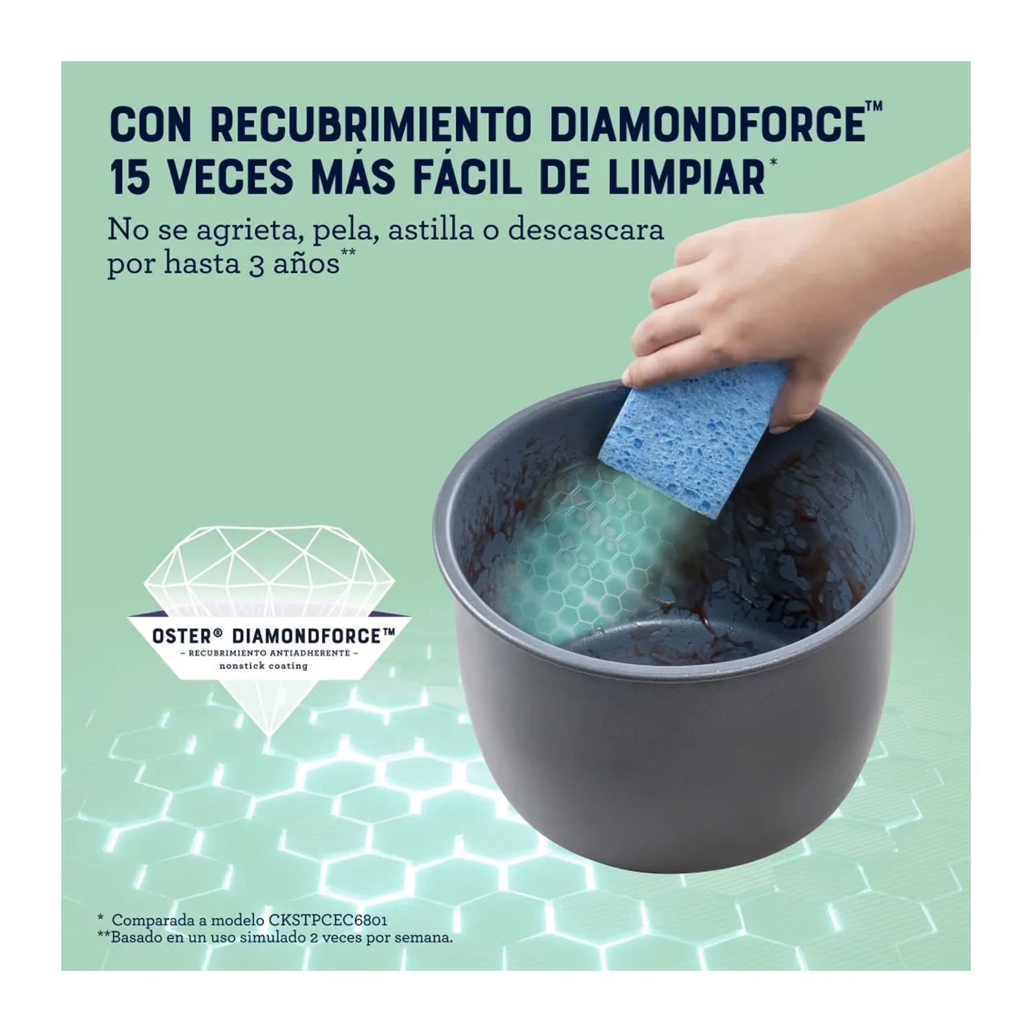Con el recubrimiento antiadherente OSTER® DIAMONDFORCE el cual está reforzado e infundido con partículas de diamante proporciona una limpieza más fácil y un rendimiento superior a lo largo del tiempo.