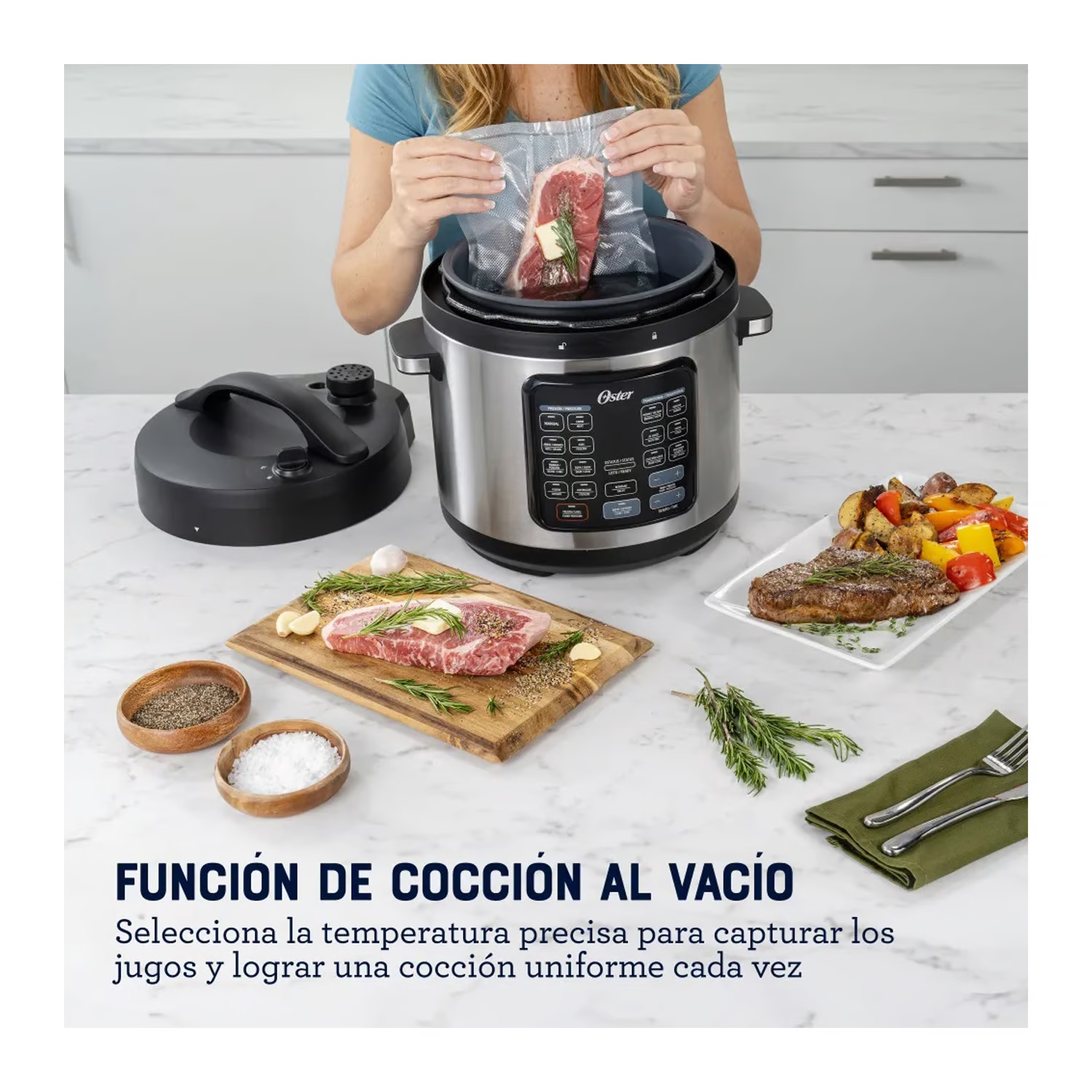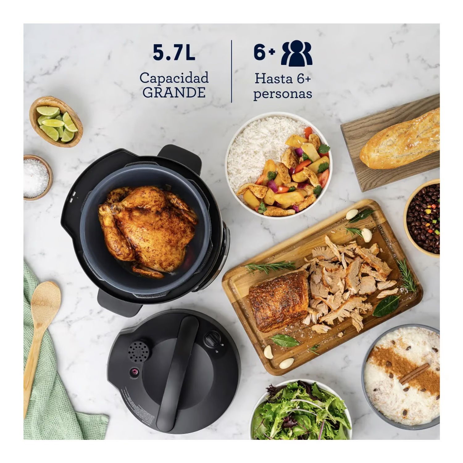 Reemplaza hasta 8 electrodomésticos: olla de presión manual, arrocera, vaporera, olla de cocción lenta, sartén, máquina de cocción al vacío y esterilizador.
