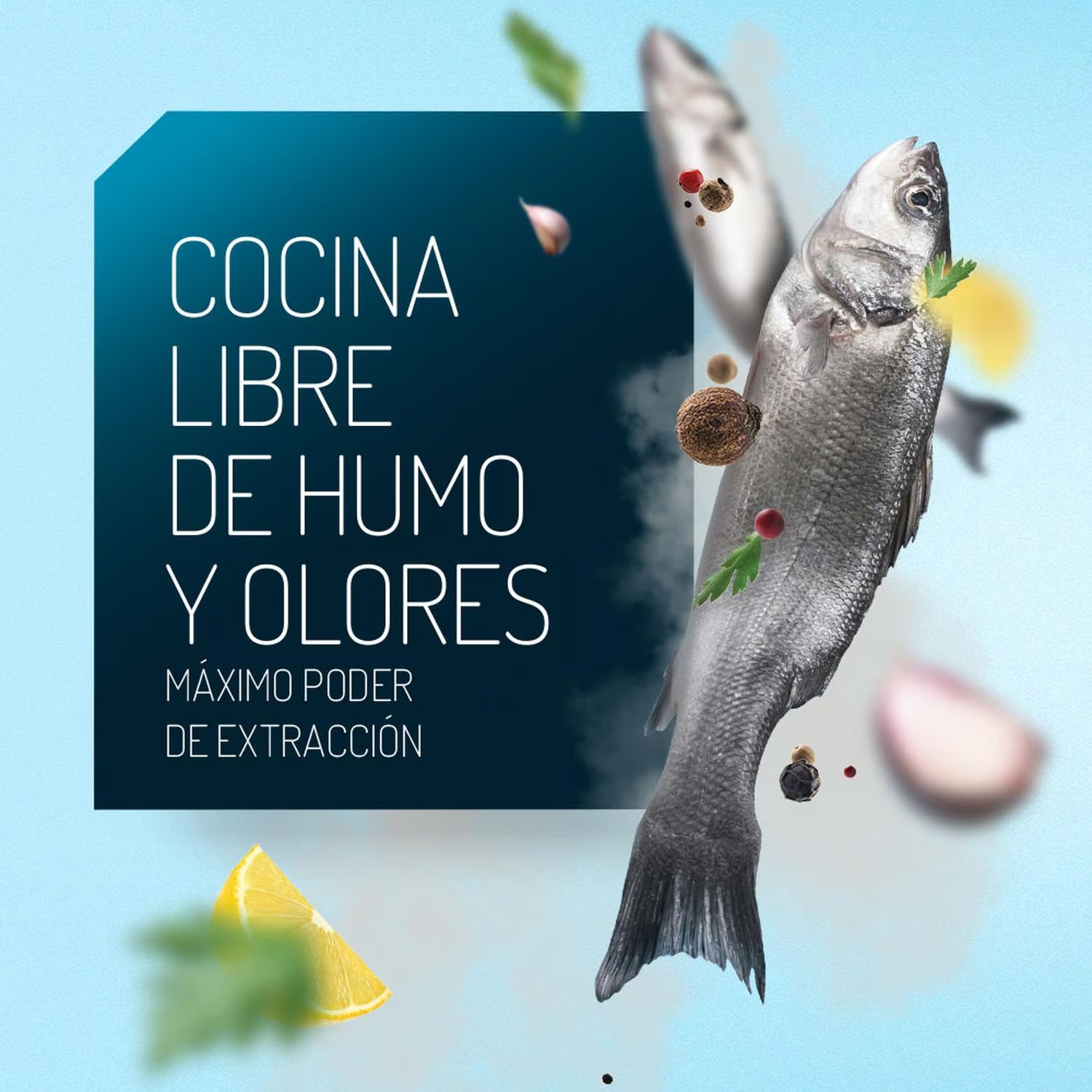 Fácil limpieza, filtro atrapa grasa en aluminio. Se recomienda lavar cada mes. Filtro de carbón que elimina olores y ayuda a purificar el aire. Se recomienda cambiar cada 6 meses.