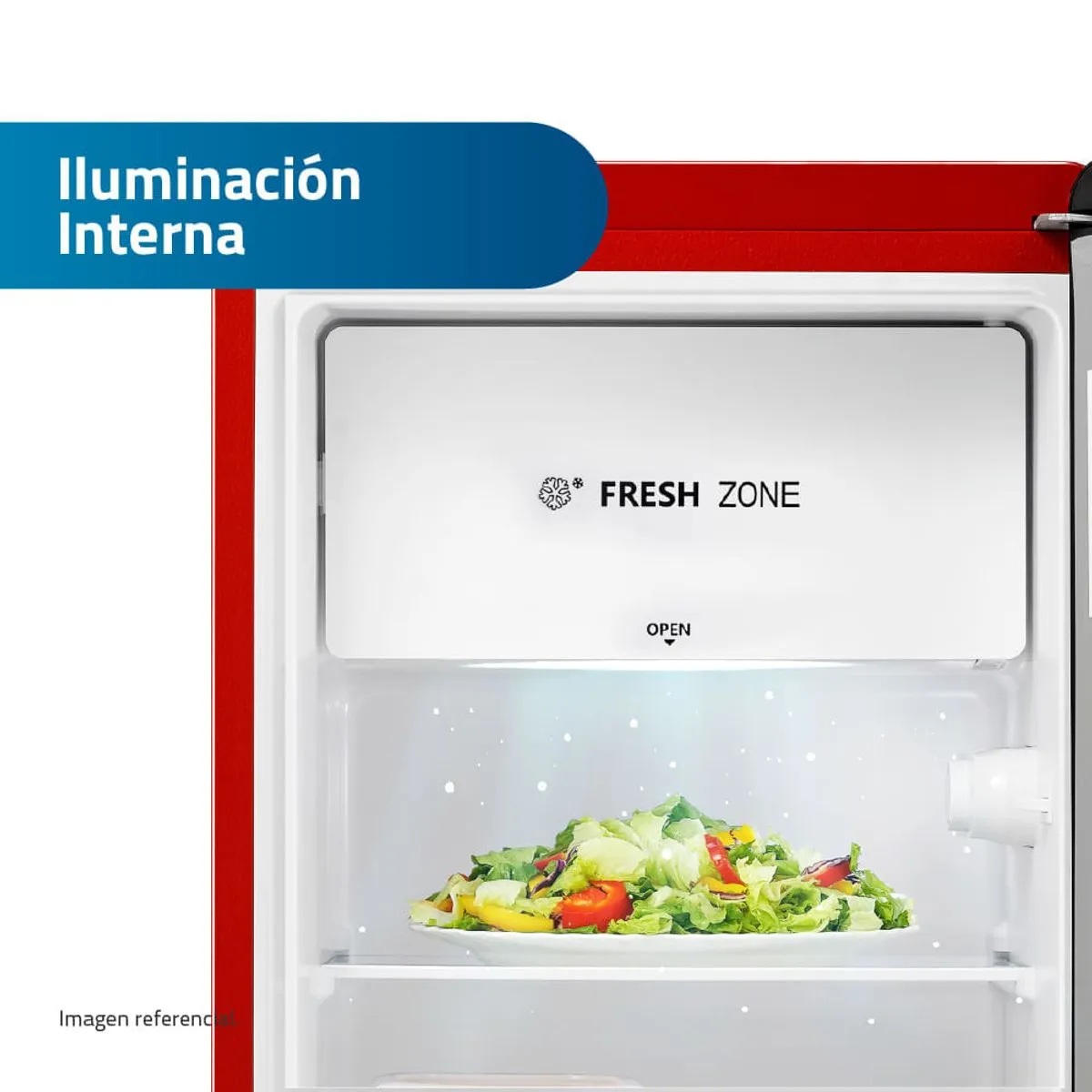Este elegante frigobar en color rojo combina diseño y funcionalidad para satisfacer tus necesidades de refrigeración en espacios pequeños, como oficinas, habitaciones o departamentos. Con una capacidad total de 90 litros, ofrece un almacenamiento eficiente en un diseño compacto y atractivo.