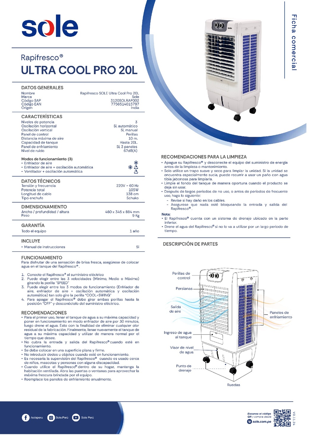 Con el Rapifresco® Sole Ultra Cool Pro 20L, disfruta de una brisa fresca y comodidad en cada rincón. No dejes que el calor te detenga y crea el ambiente perfecto para ti y tu familia.