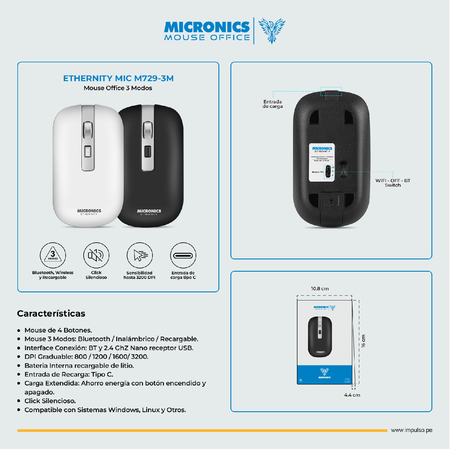 El Mouse Eternidad - MIC M729-3M es la combinación perfecta de tecnología avanzada y diseño ergonómico. Con tres modos de conexión, batería recargable y DPI ajustable hasta 3200, este mouse te ofrece una experiencia fluida, rápida y cómoda para cualquier tipo de uso, ya sea en el trabajo, el hogar o el gaming casual.