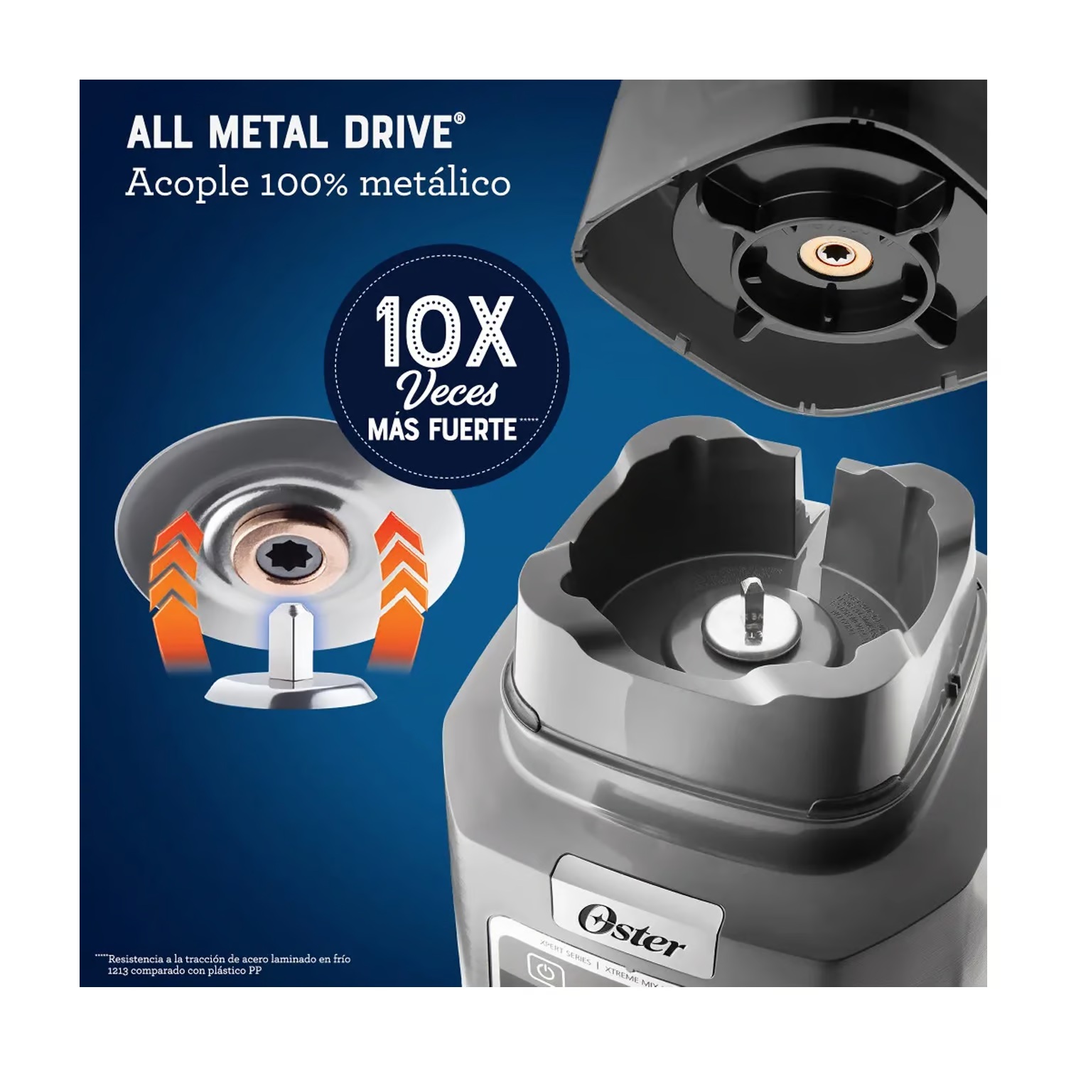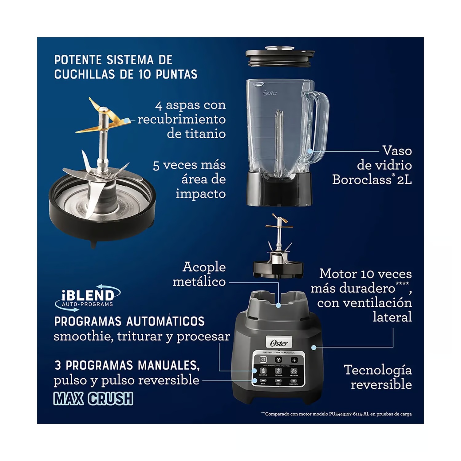 "La licuadora profesional Oster XTREME MIX combina potencia y tecnología avanzada. Su cuchilla de 4 niveles con patented* Titanium Blade Technology y 10 aspas ofrece 5 veces más área de impacto**, triturando, mezclando y pulverizando ingredientes duros. Cada nivel de la cuchilla tiene una función: las 4 aspas superiores mezclan y mantienen los ingredientes en movimiento, evitando que se queden en el fondo. Las aspas intermedias trituran alimentos duros, mientras que las siguientes pican y rebanan, perfectas para salsas y masas. Las aspas inferiores trituran, pulverizan y hacen puré. El motor de 1500 W***** es 10 veces más duradero*** y su tecnología reversible permite que las cuchillas giren en ambas direcciones para un procesamiento completo de los ingredientes. El acople metálico es 10 veces más fuerte****. El vaso de vidrio Boroclass de 2 L es resistente a olores, manchas, rayaduras e ingredientes hirviendo******. Cuenta con programas automáticos iBlend para triturar, procesar alimentos y hacer smoothies, además de 3 velocidades: Baja, Media y Max Crush, esta última para pulverizar ingredientes duros en segundos, junto con las funciones Pulso y Pulso Reversible. Incluye vaso de Tritan Blend-N-Go de 750 ml para llevar tus preparaciones a donde quieras".