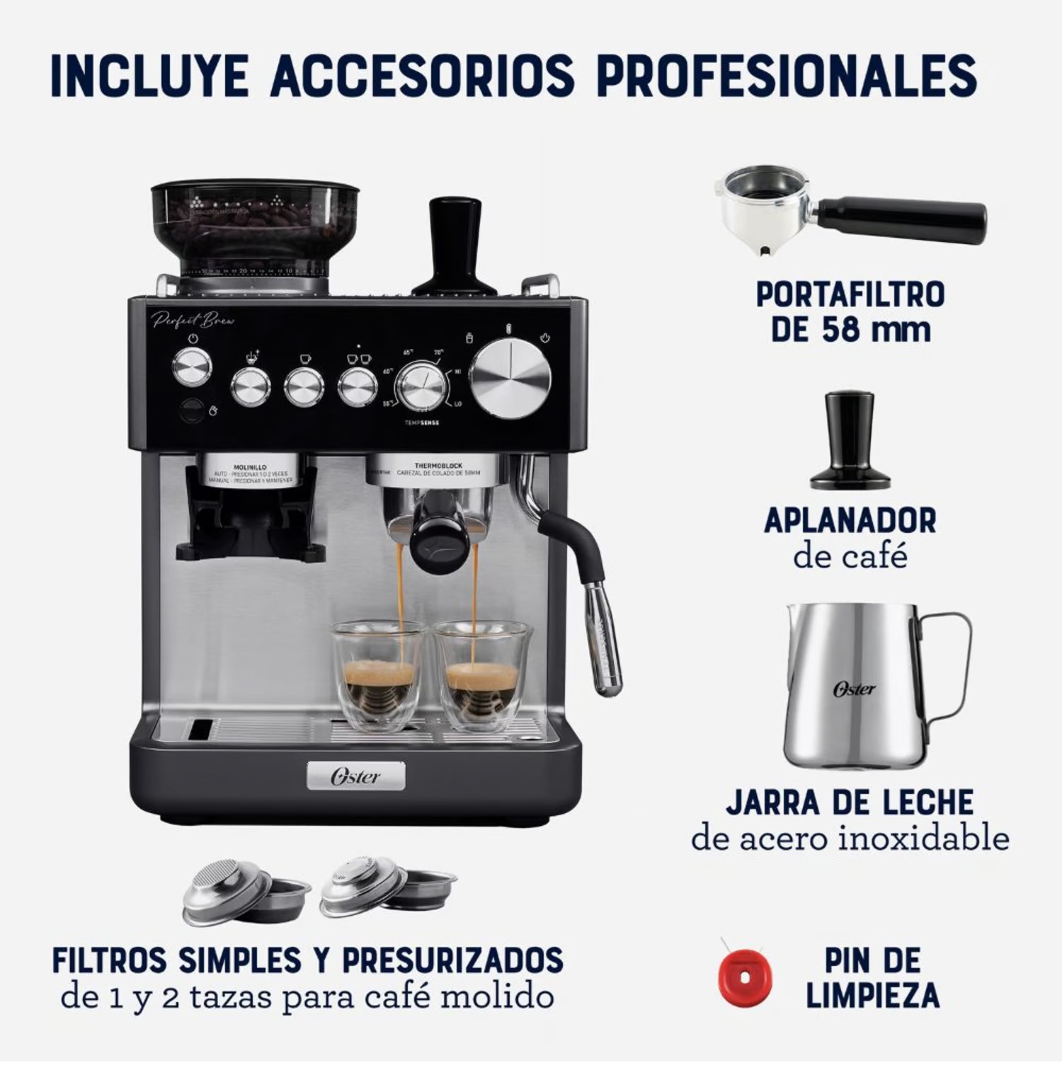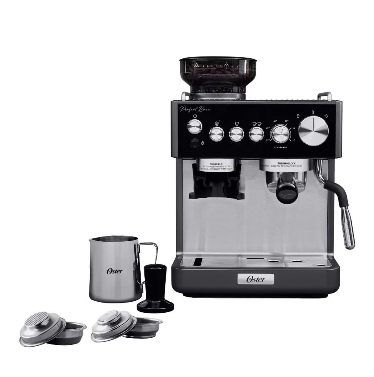La cafetera espresso Oster Perfect Brew te ofrece la calidad de una cafetería en casa, en solo tres pasos. Primero, muele tus granos de café con el molinillo cónico de muelas que cuenta con 30 configuraciones, asegurando una molienda perfecta y sin derrames gracias a su tecnología antiestática, que hace que el café molido caiga directamente en el porta filtro. Luego, extrae un espresso sencillo o doble con un solo botón, mientras su porta filtro comercial de 58 mm garantiza una mejor extracción y un sabor más intenso. Finalmente, texturiza la leche para obtener una micro espuma suave con el tubo de vapor Tempsense™, ideal para lattes y capuchinos cremosos. Con su botón de fácil limpieza y accesorios profesionales, como filtros, jarra de leche y prensador de café, tendrás todo lo necesario para disfrutar de un café perfecto en casa