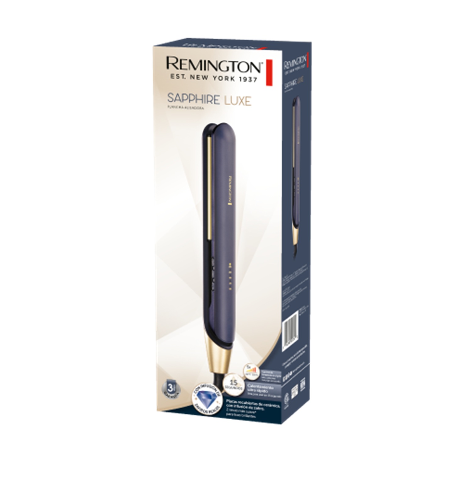 Añade un toque de lujo a tu rutina de peinado con la plancha alisadora de Remington Sapphire Luxe! Diseñada con un sofisticado acabado azul marino con detalles en color champaña, cuenta con placas recubiertas de cerámica avanzada con infusión de zafiros reales que dejan el cabello 2 veces más suave*. Gracias al control digital con cinco prácticos ajustes es posible seleccionar la temperatura adecuada para tu tipo de cabello. Además, su borde redondeado facilita la creación de ondas playeras, así como un liso perfecto, mientras que su placa flotante extralarga aplica una presión uniforme en todo el cabello, obteniendo un resultado consistente desde la raíz hasta las puntas.
