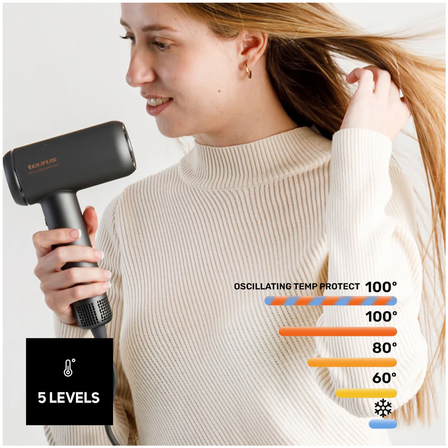 Incluye 5 ajustes de temperatura (aire frío, 60°C, 80°C, 100°C y 100°C con ciclos alternos de aire frío) y 2 velocidades, adaptándose a todo tipo de cabello y necesidades de peinado. Su boquilla concentradora magnética facilita la precisión en el moldeado y el diseño ergonómico lo hace cómodo para uso prolongado.