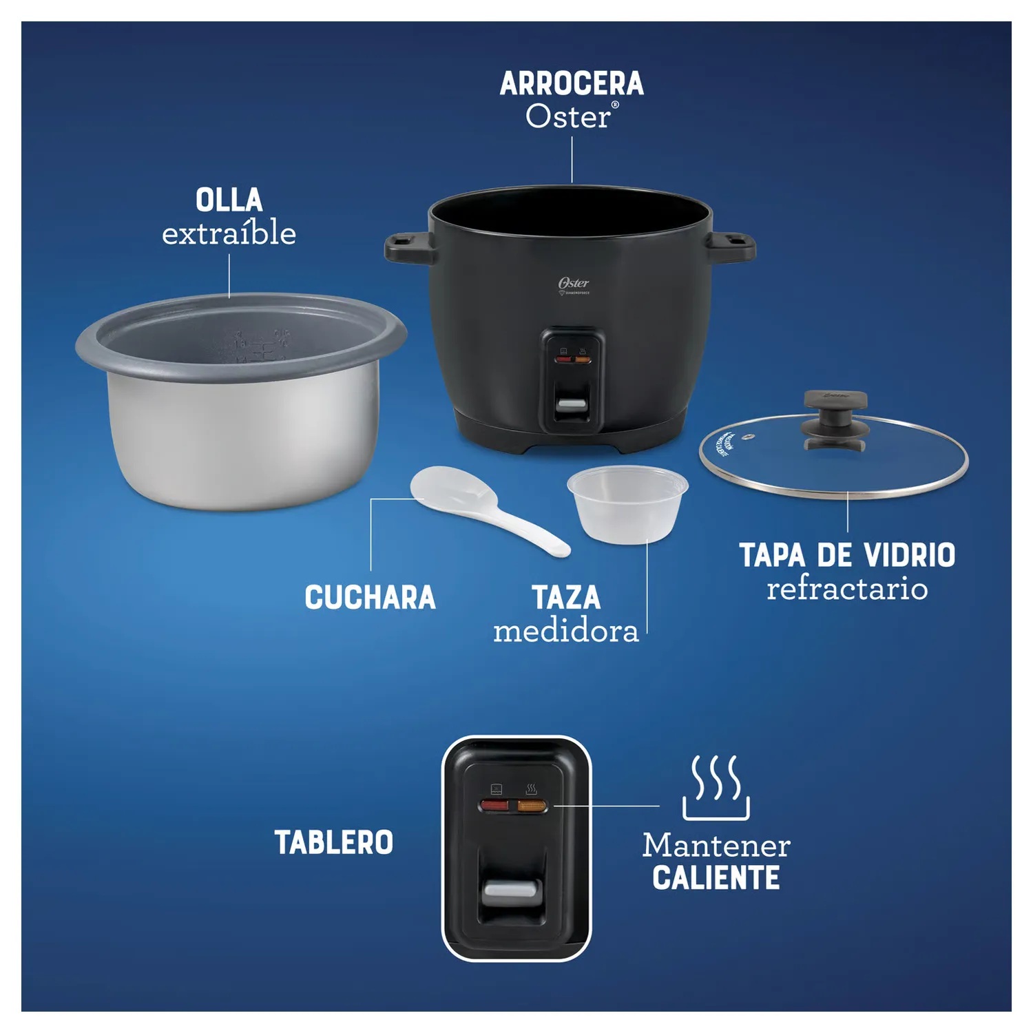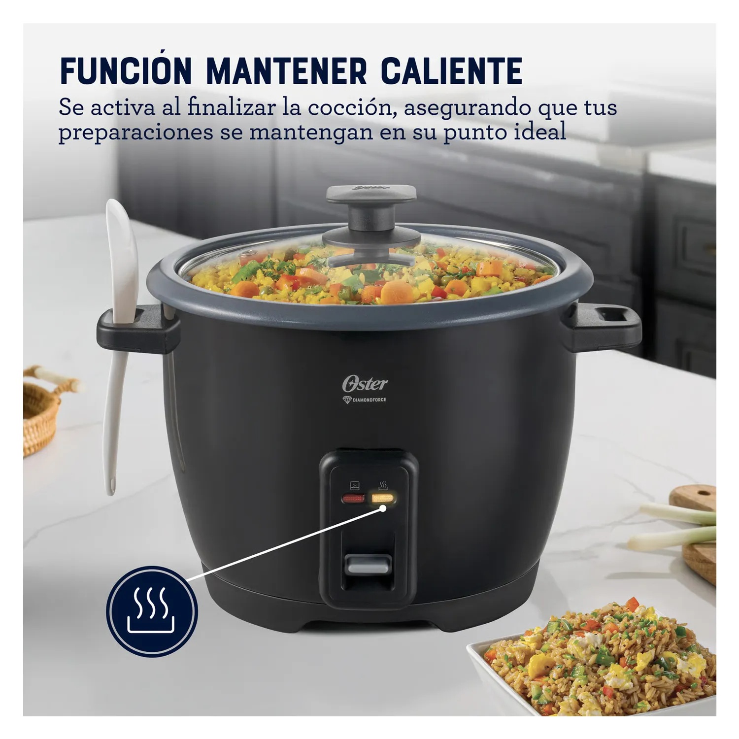 La Arrocera Oster es ideal para disfrutar de una gran variedad de platos en familia. No solo puedes preparar arroz, sino también quinoa, avena, sopas y mucho más, para sorprender a todos con recetas deliciosas y fáciles en un solo electrodoméstico. Su recubrimiento antiadherente Oster DiamondForce es 15 veces más fácil de limpiar* y no se daña ni se desgasta con el uso, garantizando que te acompañe por mucho tiempo. Además, la función automática Mantener Caliente asegura que tus comidas estén en su punto perfecto hasta el momento de servirlas. Las asas están diseñadas para sostener la tapa y la cuchara cómodamente, sin complicaciones. Incluye una taza medidora y una cuchara para medir y preparar todas tus recetas.
