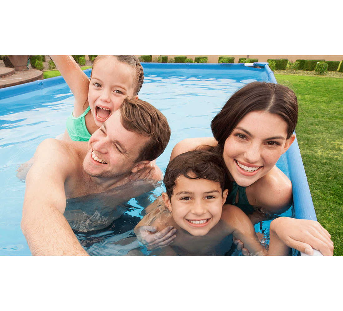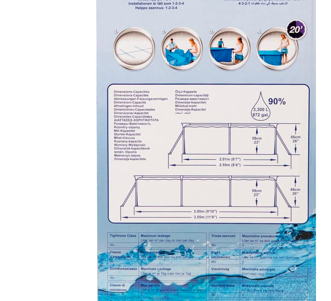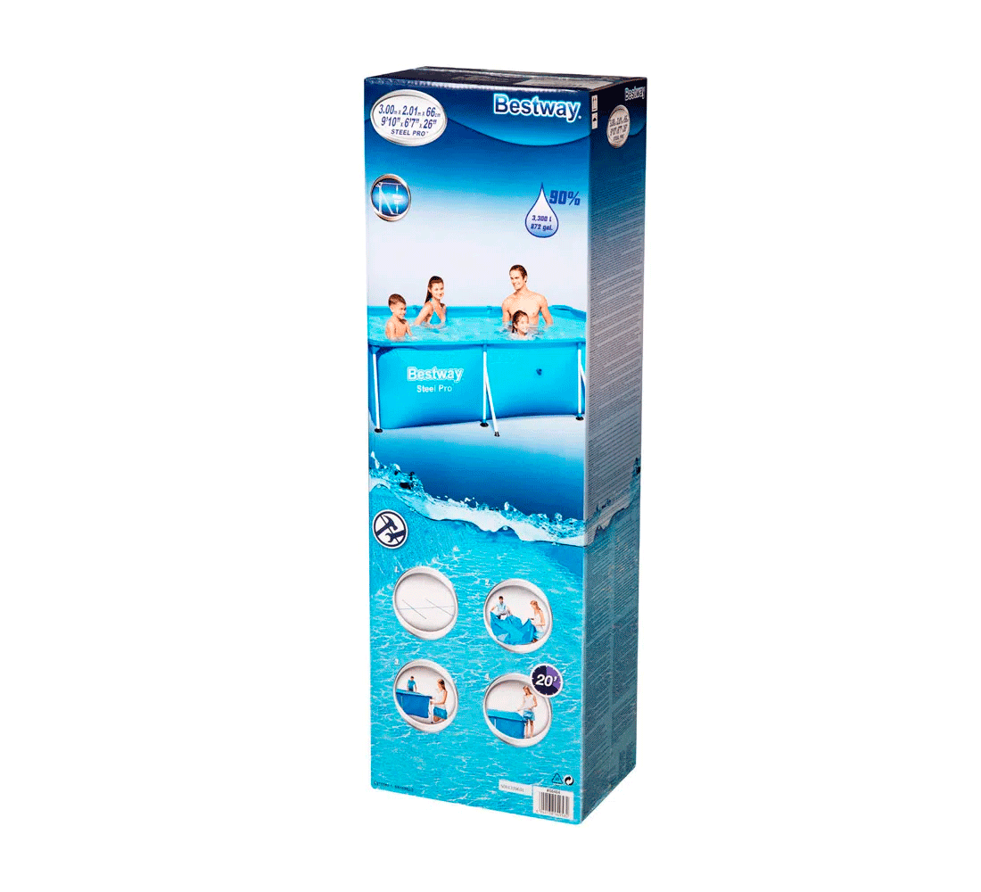 Paredes laterales de 3 capas de PVC resistente y poliéster. La válvula de drenaje de control de flujo incorporada hace que sea fácil de drenar uniendo la válvula a una manguera de jardín (con el adaptador incluido) para drenar el agua. Las paredes laterales extra fuertes de esta piscina están construidas con Tritech ¿, un material reforzado de 3 capas con un núcleo de malla de poliéster encerrado entre dos capas de material de PVC de alto calibre. Esto crea un espesor total de 0.40-0.80mm (16-32 calibre) dependiendo del tamaño de la piscina, ofreciendo fuerza y durabilidad superior. Marcos de metal resistente a la corrosión. Fácil de desmontar para su almacenamiento fuera de temporada. La forma rectangular proporciona más área para nadar y jugar.