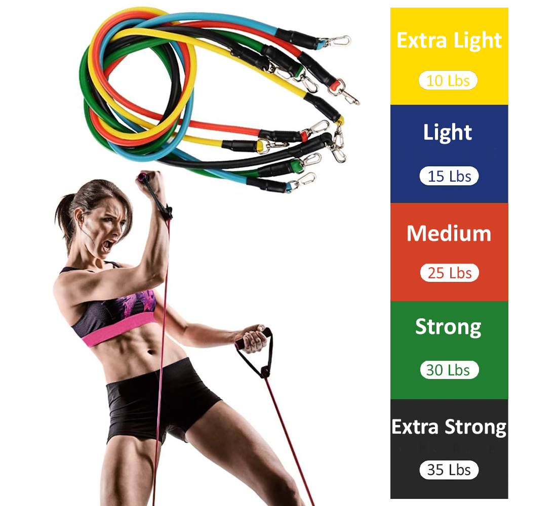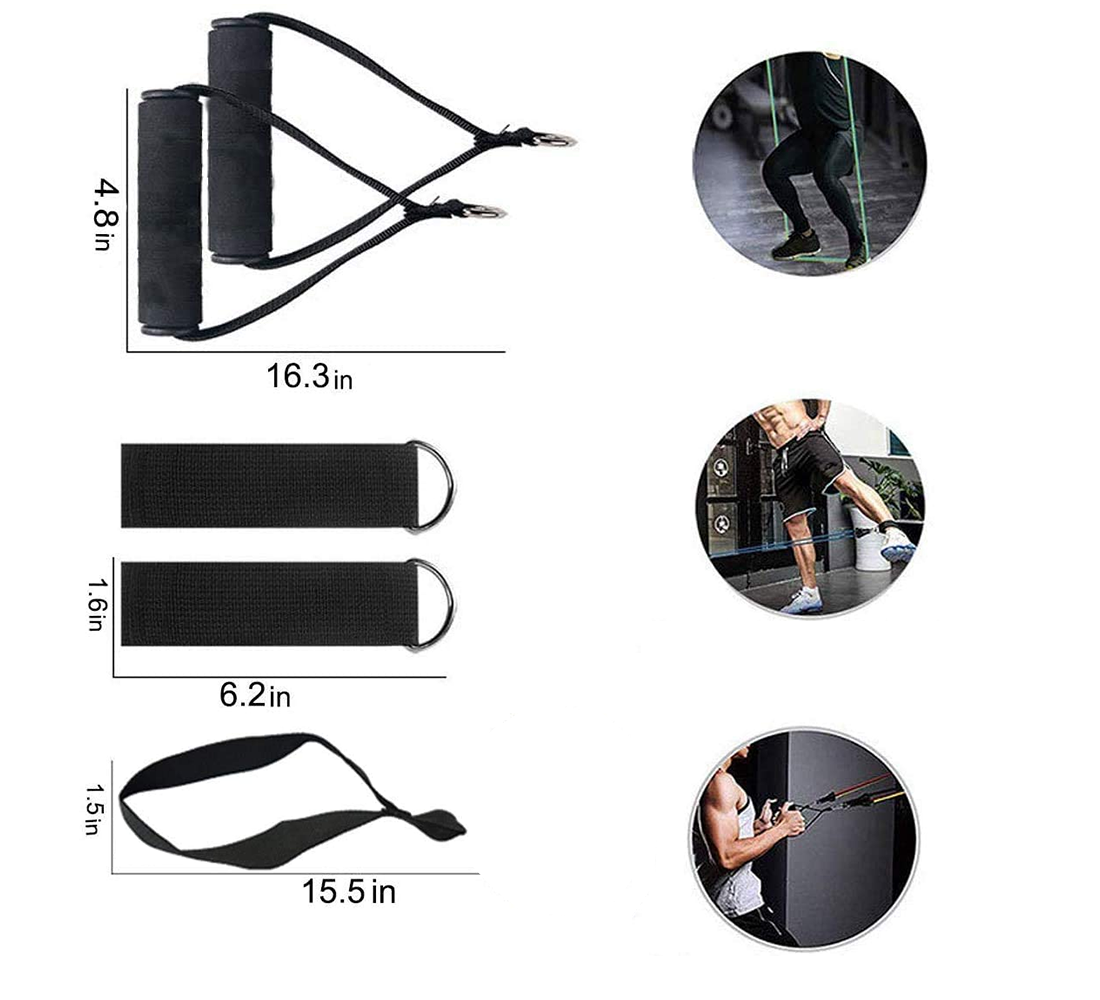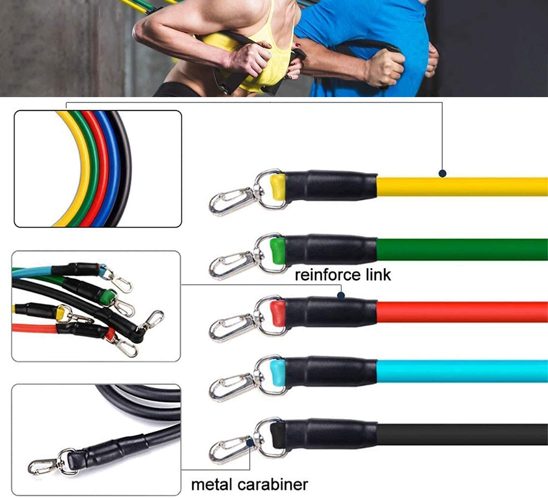 Bandas de resistencia hecho de tubo de TPE de alta calidad, que es más resistente que el caucho ordinario;Hebilla de metal, superficie chapada en oro, muy resistente; Las manijas están cubiertas de una espuma suave que absorbe el sudor. Equipo de entrenamiento seguro y cómodo.