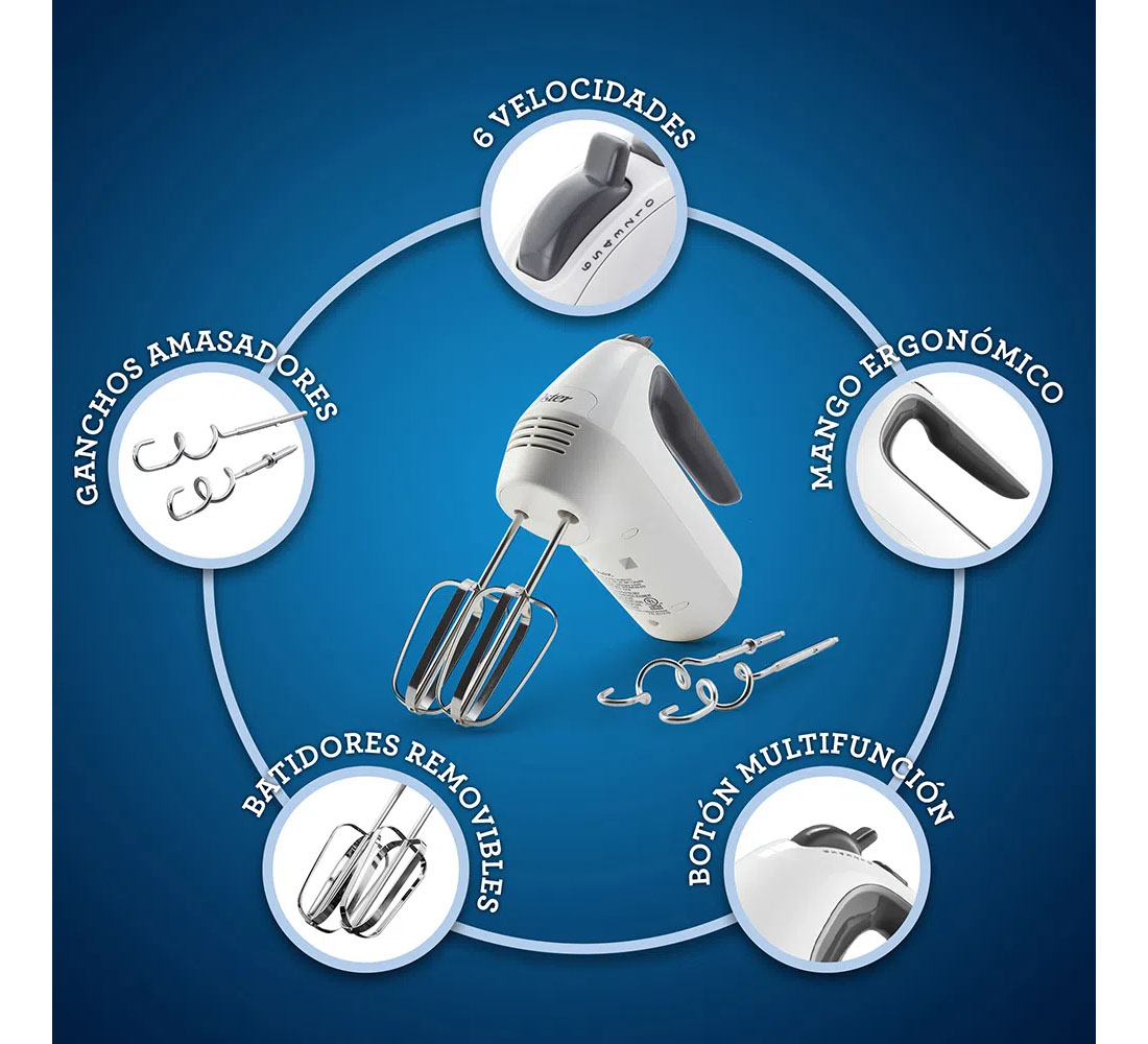 Esta práctica batidora de mano Oster® te permite preparar desde gruesas masas de galletas hasta delicados merengues. El diseño ergonómico de su mango te brinda máxima comodidad para que prepares deliciosas comidas y postres con mayor facilidad. Además, cuenta con 6 velocidades y una función de Turbo que provee potencia adicional al toque de un botón. Ya sea para batir o amasar, esta batidora de mano Oster ® te hará la tarea mucho más fácil.
