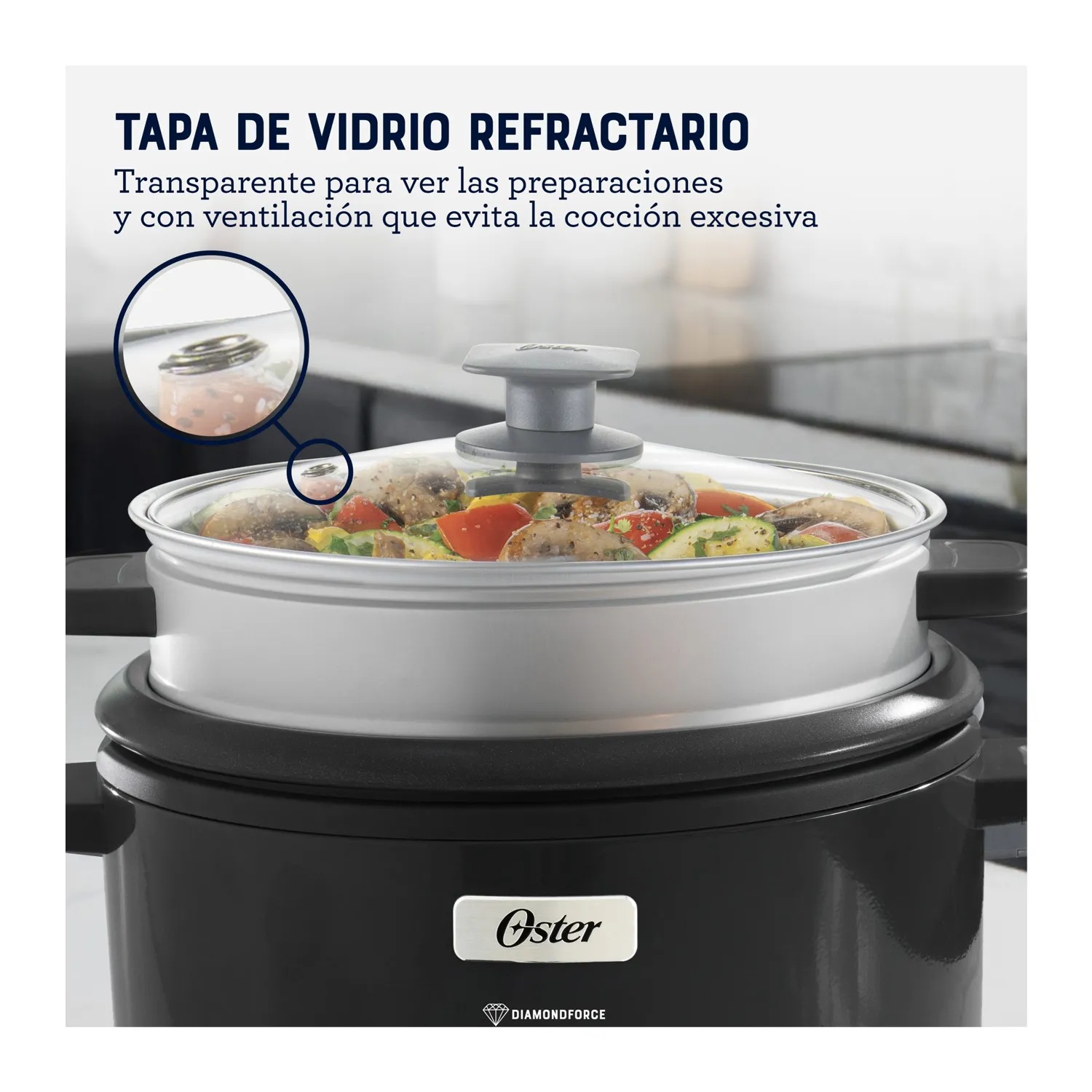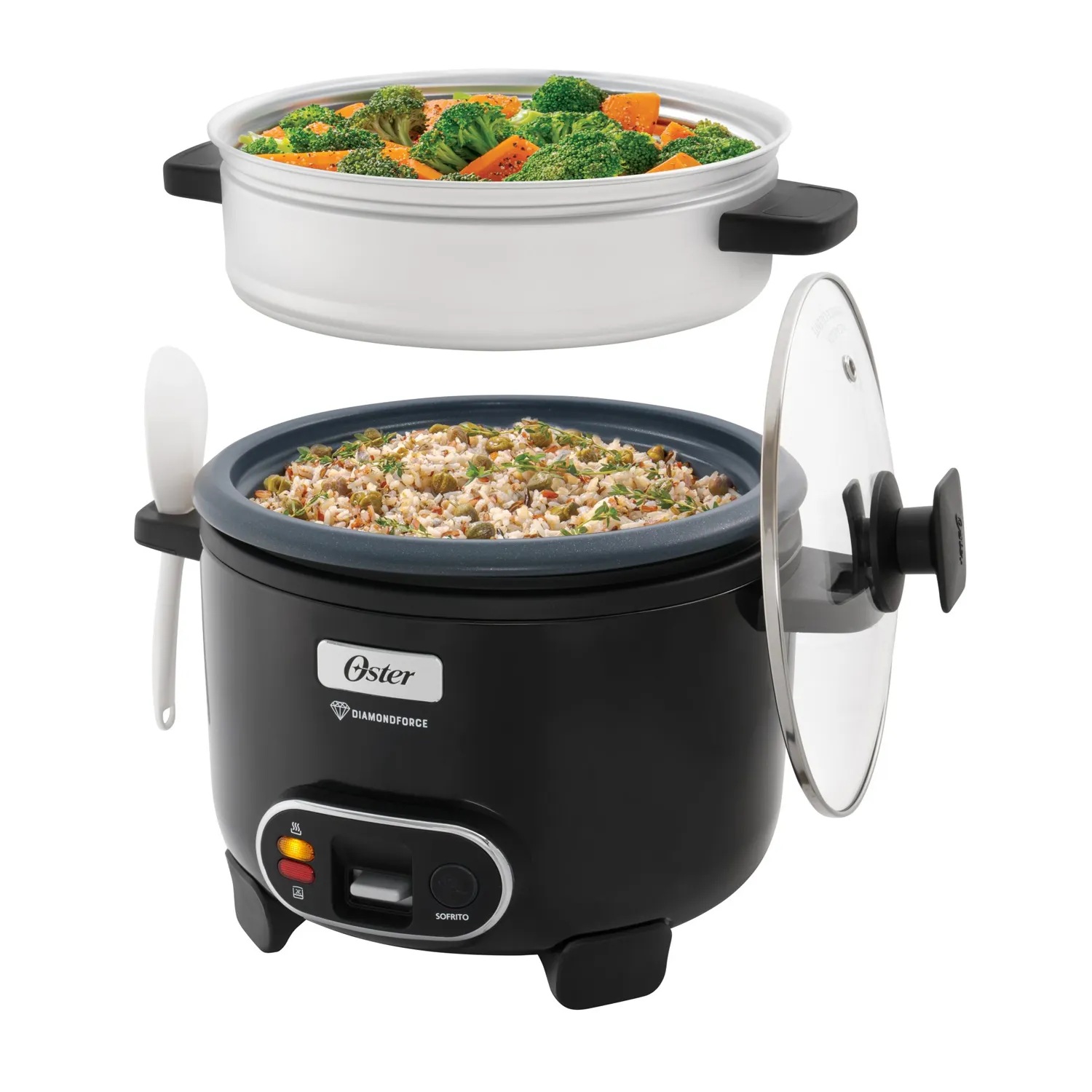 La Arrocera 3 en 1 de Oster simplifica tus comidas diarias. Cocina arroz sin que se pegue, gracias a su recubrimiento antiadherente Oster DiamondForce, que además es 15 veces más fácil de limpiar* y no se daña ni se desgasta con el uso**. Sofríe ingredientes como cebolla o ajo antes de agregar arroz, quinoa o lo que prefieras. Usa la vaporera para cocinar vegetales o pescado al mismo tiempo. Las asas están diseñadas para sostener la tapa y la cuchara cómodamente, mientras que la función Mantener Caliente asegura que todo esté siempre a la temperatura perfecta.
