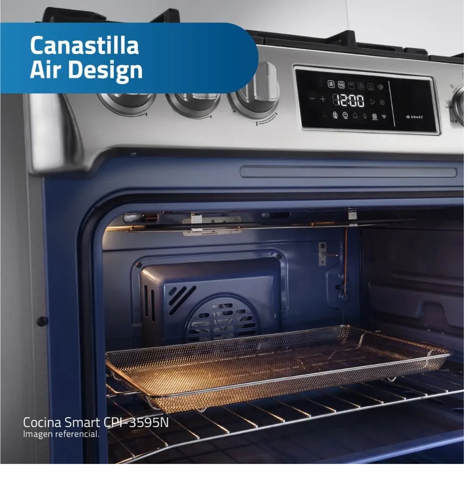 Su horno multifunción de 109 litros integra 6 funciones, incluyendo AirFry y Turbo, además de grill eléctrico, termostato, luz interna y vidrio panorámico. Incorpora 2 parrillas fijasbandeja y plancha freidora.