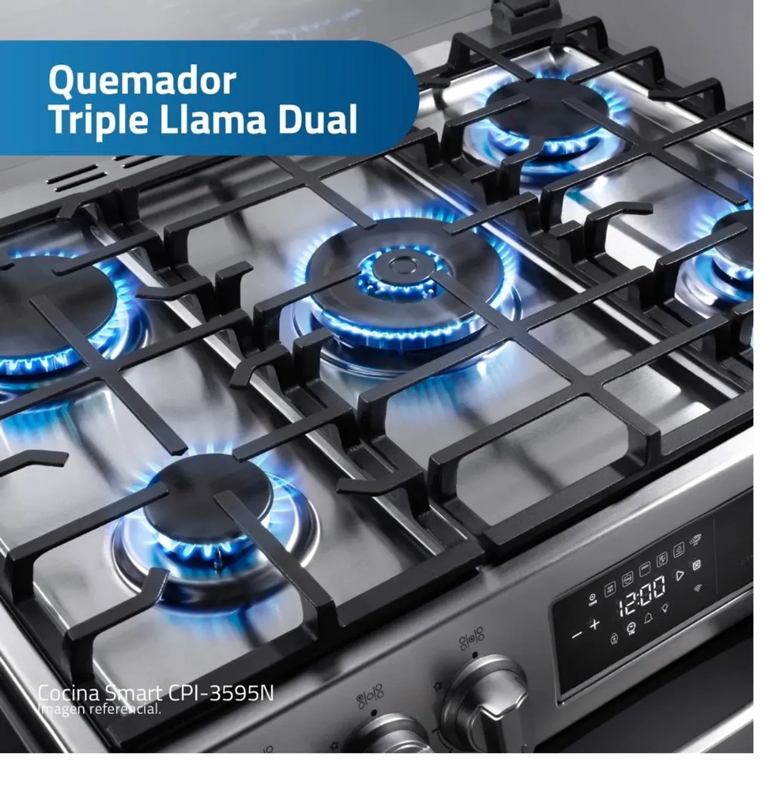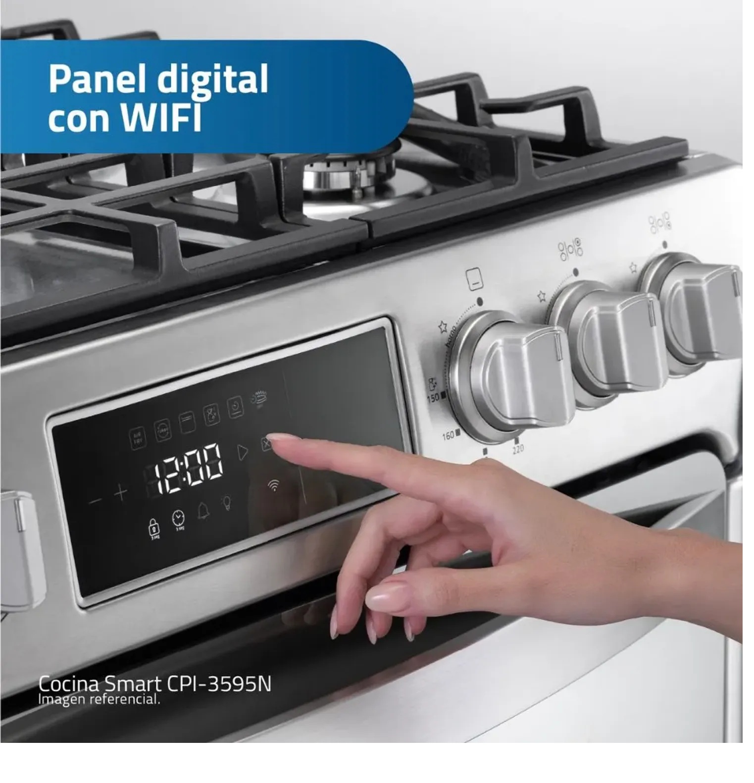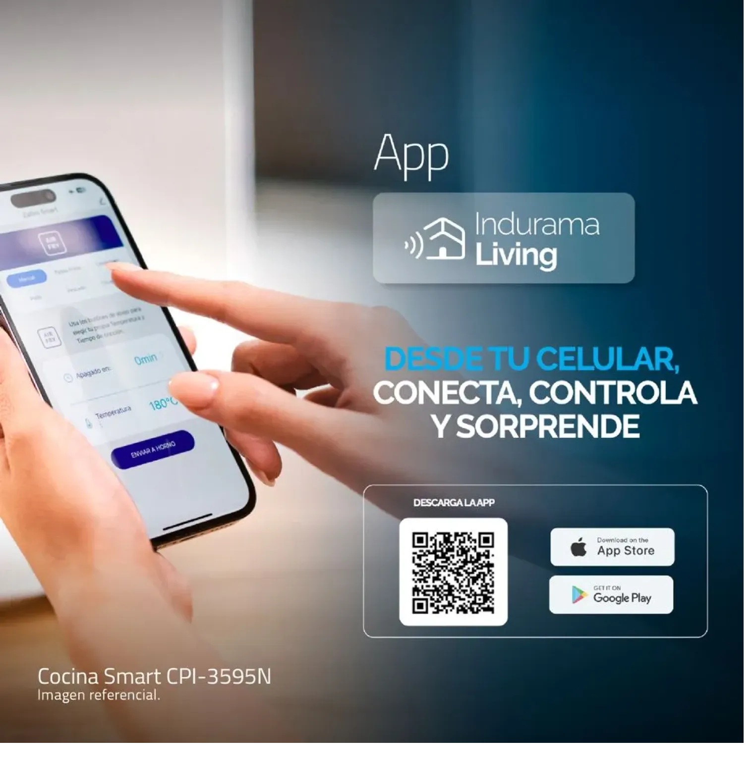 La cocina ofrece un panel touch con conexión Wi-Fi, que permite controlar funciones desde el celular mediante la app Indurama Living, así como control por voz con Alexa y Google Assistant. Además, cuenta con timer digital, encendido electrónico en quemadores y horno, bloqueo de seguridad en panel touch y sistema corta gas programable.