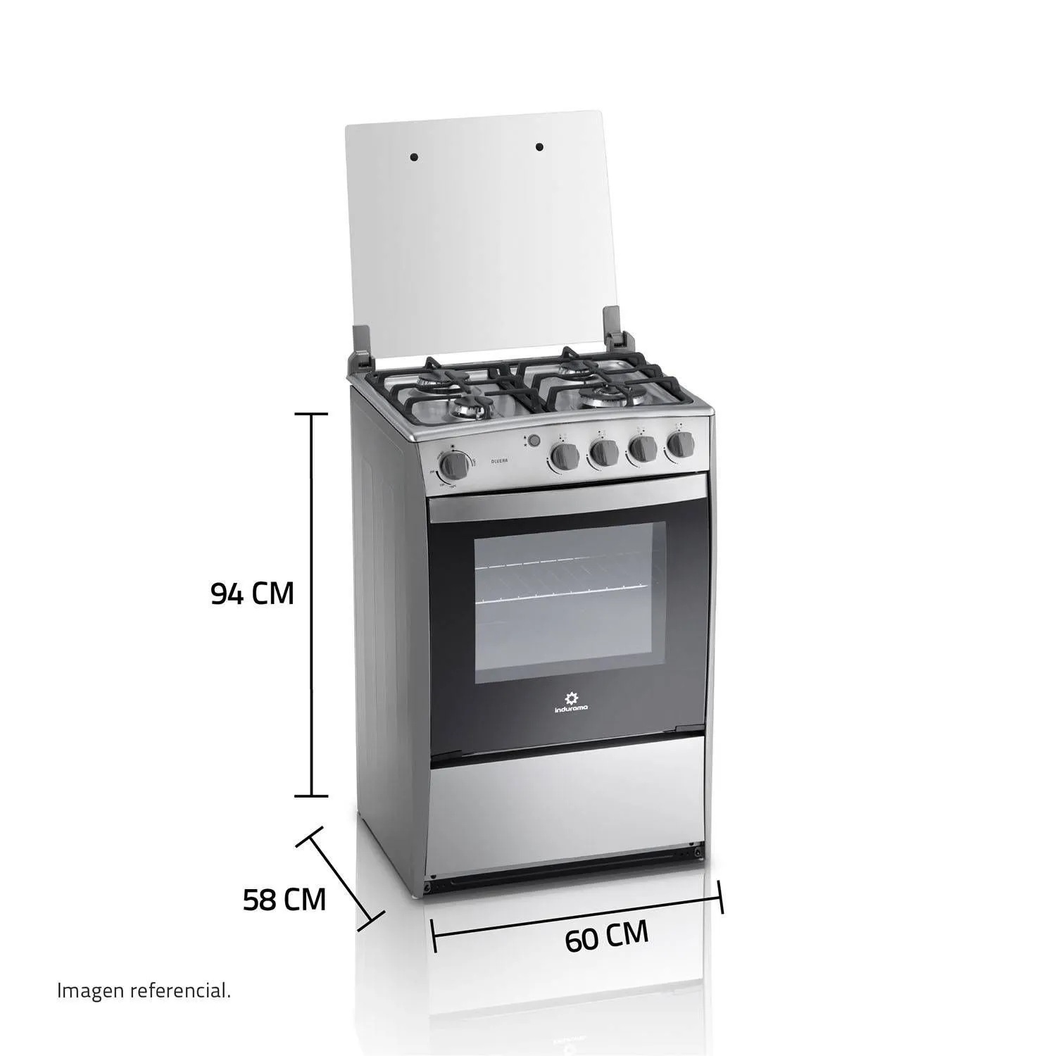 El horno a gas incluye grill, luz interior y doble vidrio templado, que asegura mejor aislamiento y seguridad. Además, cuenta con encendido eléctrico y termo control, facilitando un horneado preciso y práctico