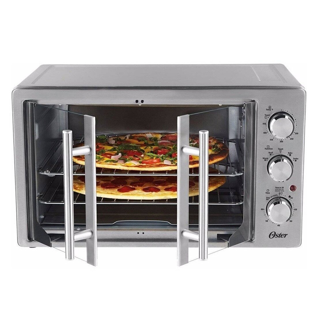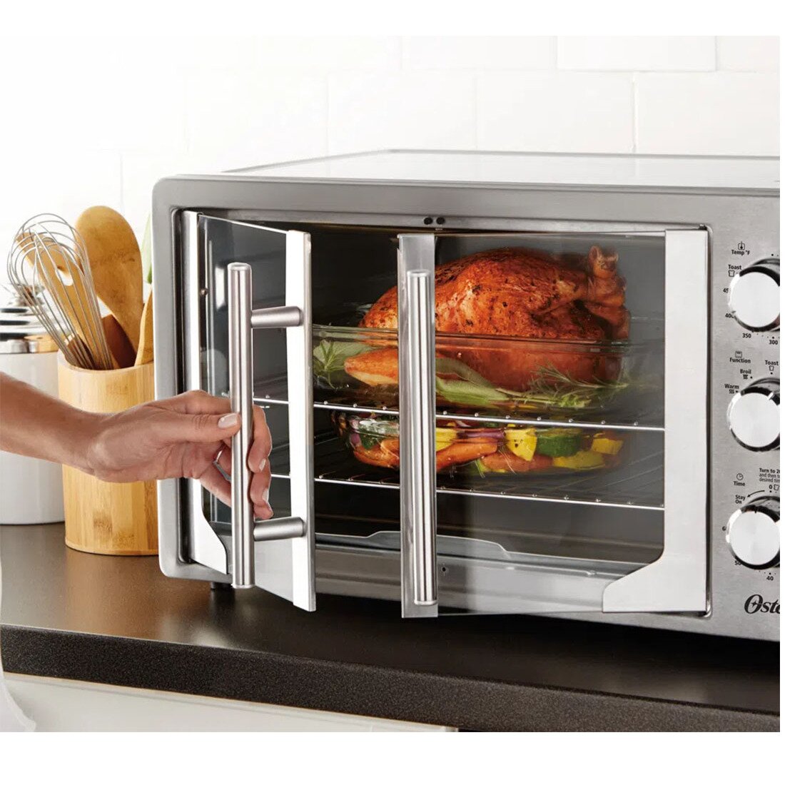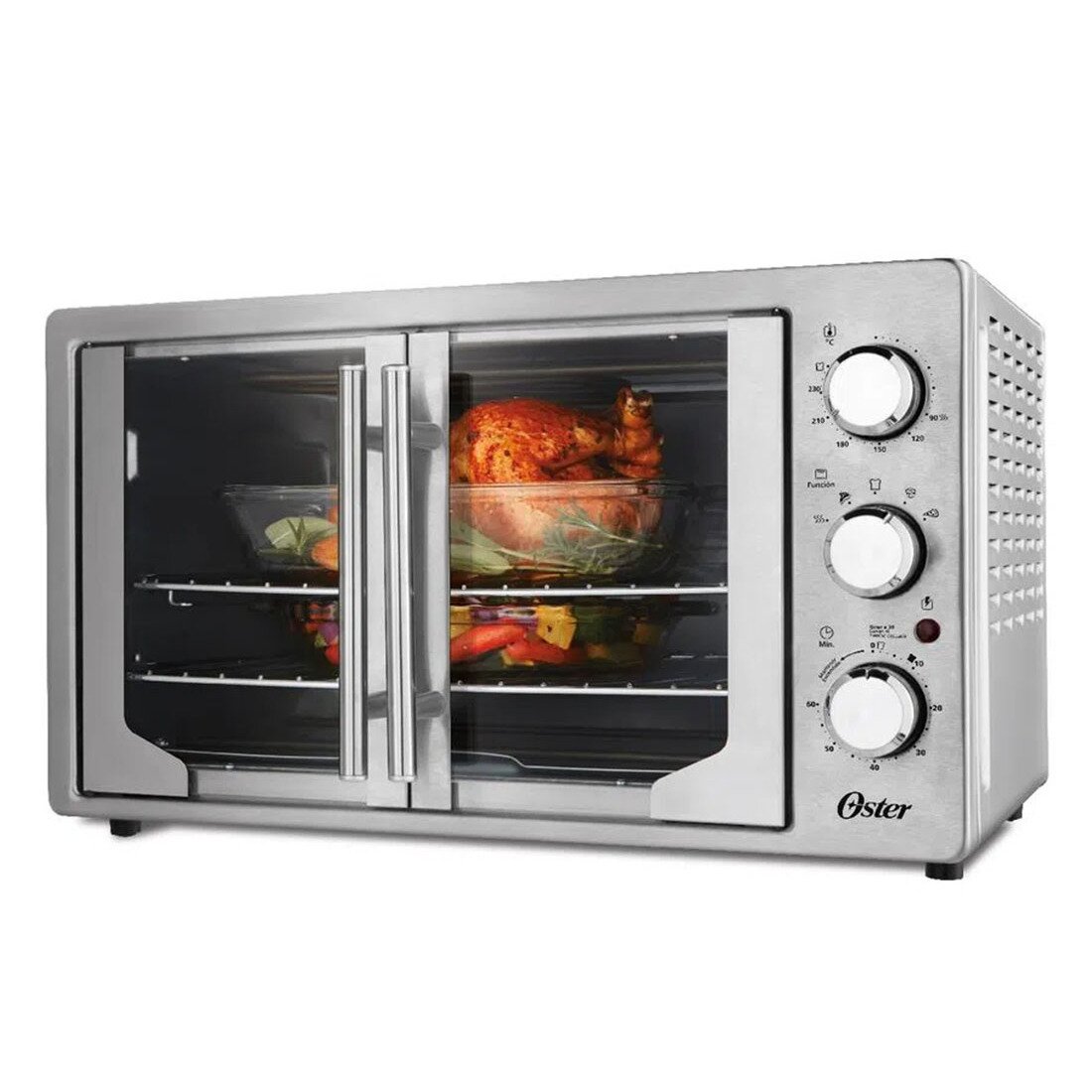 Nunca antes un horno de mesa ofrecía tanta facilidad para preparar pollos enteros, asados o recetas para una familia grande. Su doble puerta permite entrar y sacar las preparaciones sin ninguna dificultad.